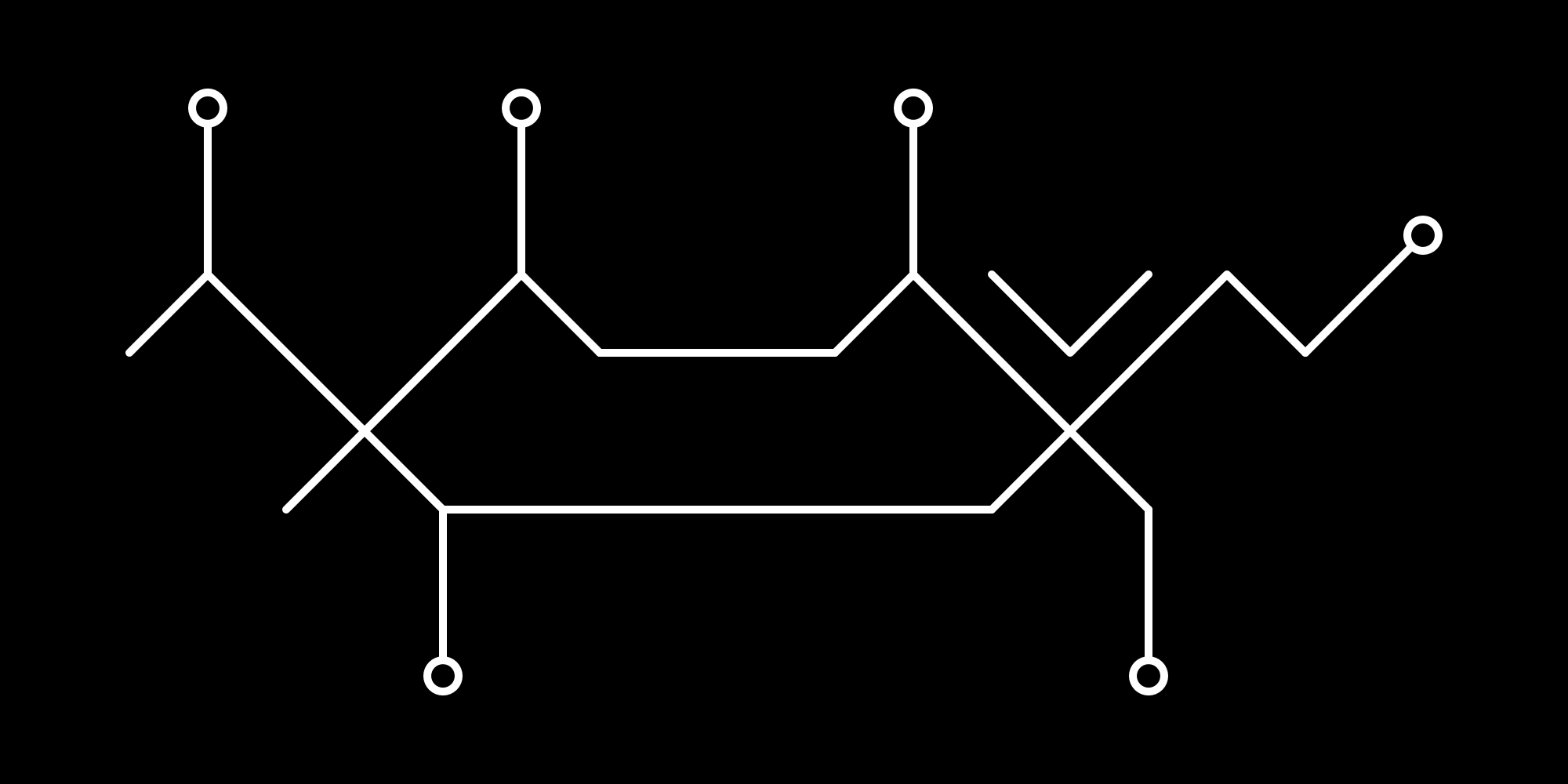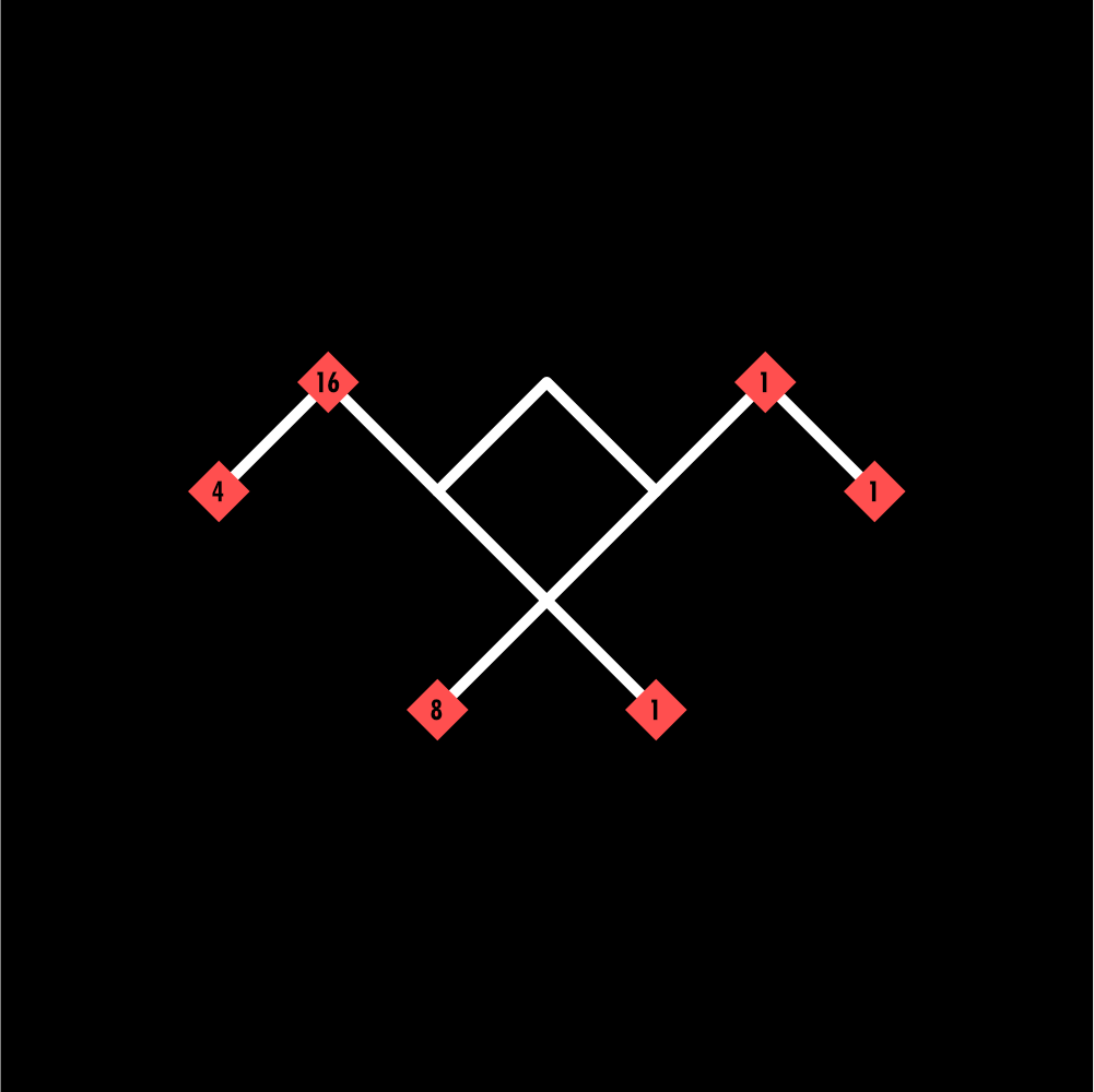 As you may have noticed, each socket on the left side of a radix doubles as it gets larger. From 4 becomes 8, and after, 16. Large numbers are a bit tricky, and can come as a challenge for some. These numbers are read right-to-left, and use a modified socket value on additional radices. On the rightmost radix will be the default socket values of 1, 4, 8, and 16. To represent a number larger than 31, we will connect a new radix to the left, doubling the socket value with each increment, and leaving out the crossbar entirely (as this is a single radix). This means the socket values on the right side from top to bottom will be 128, 32, 64. And on the left, continue doubling. From top to bottom the left will appear as 1024, 256, 512. This allows for an exponential increase in upper limit, and will result in smaller radix groups to represent large numbers. Here we can see a radix of value 1234:
